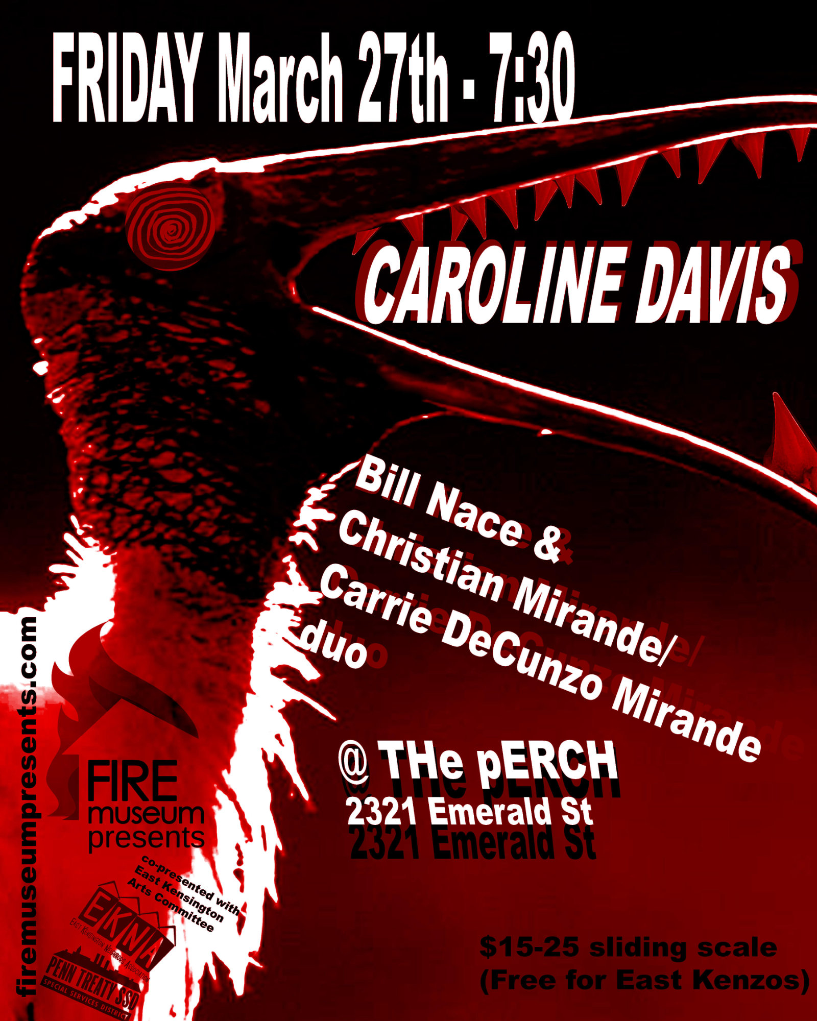 Fire Museum Presents and EKAC host a night of experimental music headlined by Caroline Davis and featuring performances from Bill Nace & Christian Mirande/Carrie DeCunzo Mirande Duo. FREE to attend for East Kensington residents.