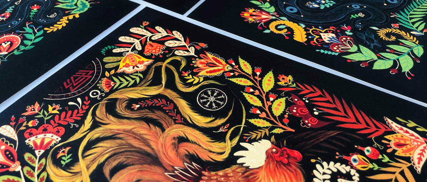 We’re longtime fans of Maryann Held’s work, and we love getting to print it! These pieces were printed on our Neenah Stardream Metallic Gold 105lb Cover. The metallic gold paper gives it a luminous quality that goes well with the style of these prints, and makes the whole thing feel magical. Visit Maryann’s website to see more and shop.